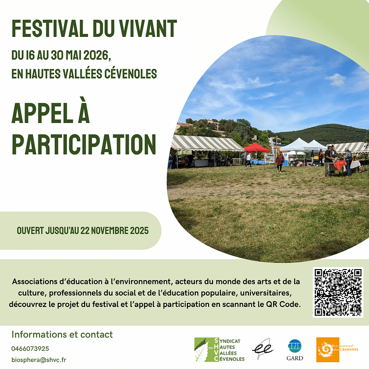 Dans la continuité de la journée d’échanges organisée le 23 mai dernier à Biosphera (Cendras), nous souhaitons associer des structures du territoire à la construction et à l’animation du futur festival. C’est l’objet de cet appel à participation que nous lançons aujourd’hui. Associations d’éducation à l’environnement, acteurs du monde des arts et de la culture, universitaires, professionnels du social ou de l’éducation populaire, nous attendons vos propositions pour le futur festival.