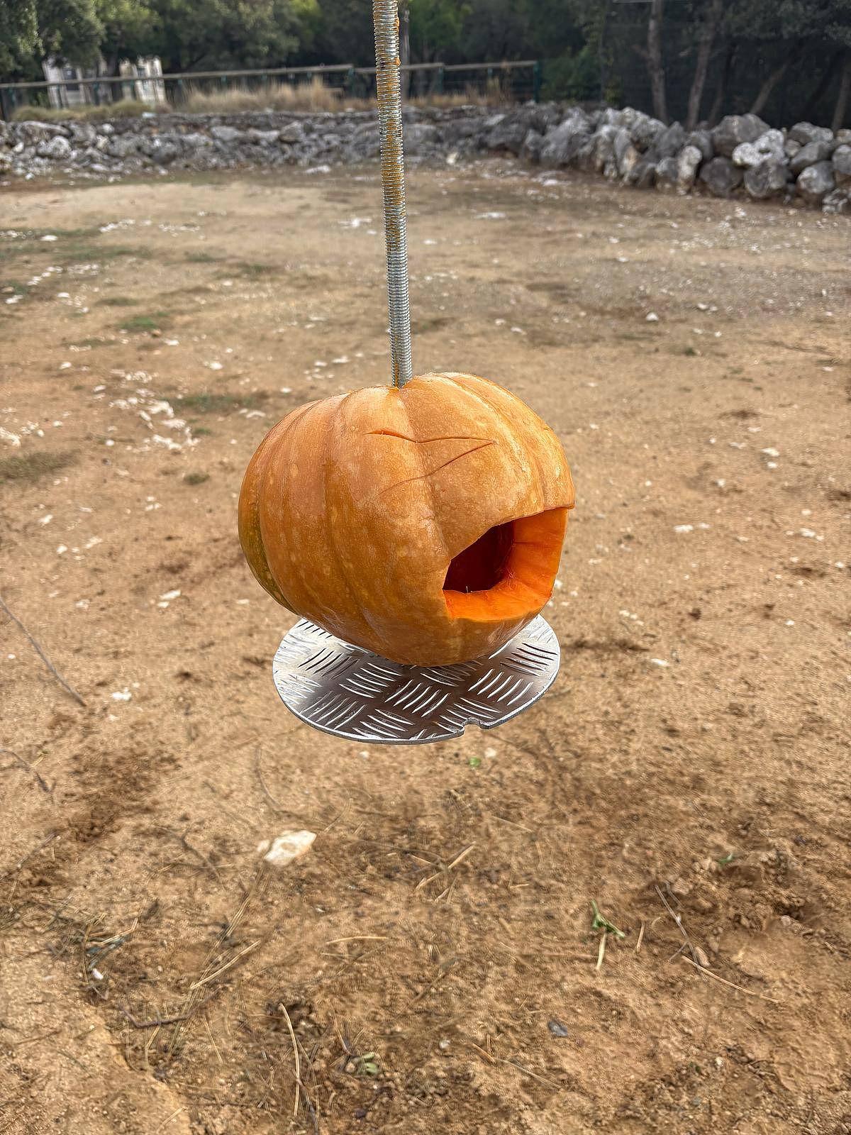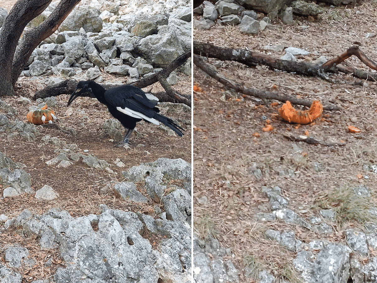 De nature plus téméraire, notre groupe de 4 calaos ont découvert leur citrouille remplie d’insectes et de souris. En plus de se régaler avec le contenu ils se sont amusé avec le contenant ! Les coups de becs puissants ont eu raison de cet enrichissement organique.