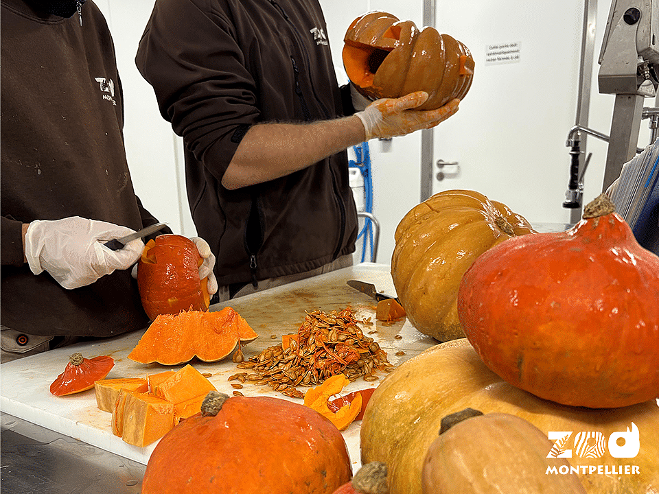 A l’occasion d’Halloween, l’équipe des soigneurs animaliers a creusé et sculpté toute sorte de courges pour en faire des enrichissements !