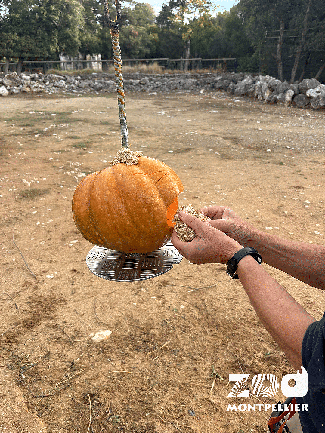 Après avoir attribué le nombre, la taille et le contenu des citrouilles en fonction des espèces, les soigneurs les ont disposés dans l’enclos. Elles ont été cachées ou mises en évidences mais toujours disposées à des emplacements permettant aux soigneurs et aux visiteurs d’observer les différentes réactions des individus face à la découverte de cette nouveauté !