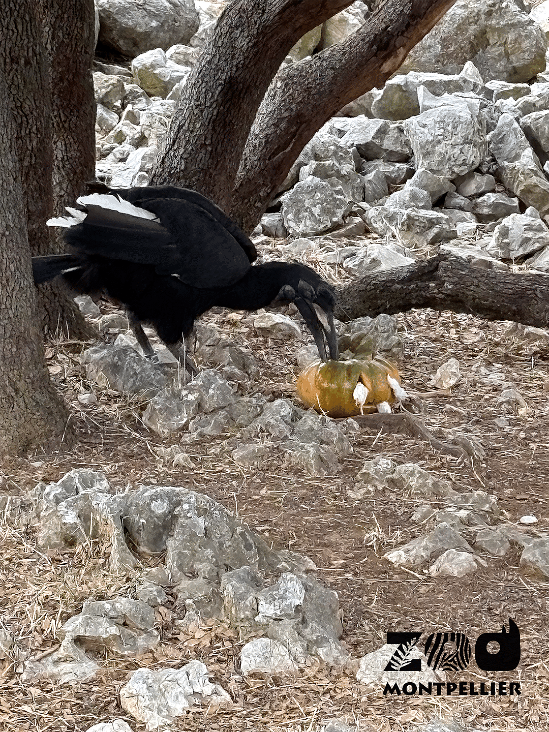 Chez les girafes (Giraffa camelopardalis rothschildi) et les Bucorves d’Abyssinie (Bucorvus abyssinicus) partageant le même enclos, les citrouilles ont eu un franc succès.