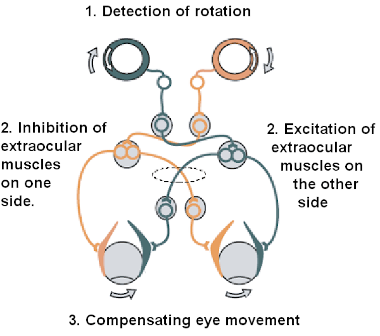 Les origines de la cybercinétose sont en partie spécifiques à la technologie des casques de RV, et pour l’autre part communes aux autres situations productrices de cinétoses. Parmi les raisons spécifiques à la RV : la technologie encore balbutiante qui introduit une série d’incohérences. Par exemple, le délai dans la boucle sensori-motrice (entre le moment où nous bougeons la tête et celui où l’image à l’intérieur du casque est mise à jour) atteint des valeurs de 50 à 200 millisecondes. Cela produit toutes sortes de perturbations neuro physiologiques. Par exemple le fonctionnement du réflexe vestibulo-oculaire qui permet de maintenir la direction du regard lorsque l’on tourne la tête.