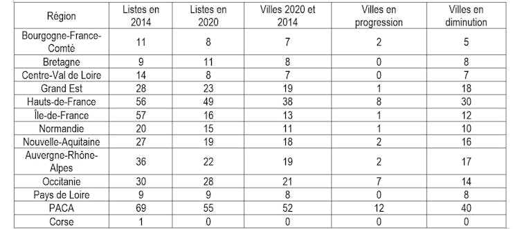 Le résultat de cette stratégie de notabilisation est un échec retentissant et plein de paradoxes. L’attribuer à la crise sanitaire serait totalement exagéré. L’échec précède le 15 mars 2020 : on remarque en effet que le RN n’est pas même parvenu à présenter, dans les villes de plus de 10 000 habitants, autant de listes qu’en 2014. Et loin s’en faut : 262 listes seulement, contre 369 en 2014 !