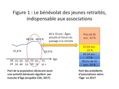 Cela se constate par un fort pourcentage de bénévoles parmi les 55-74 ans soit 48,3 %, par un temps de bénévolat plus élevé (58 % des plus de 65 ans engagés dans une association y consacrent plus de cinq heures par semaine) et par un engagement essentiel à la tête des associations comme le montre la figure 1 (créée sur la base des travaux de Viviane Tchernonog et de Lionel Prouteau).