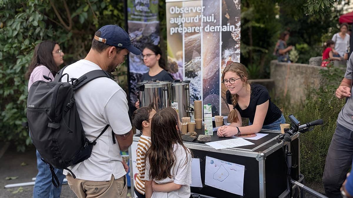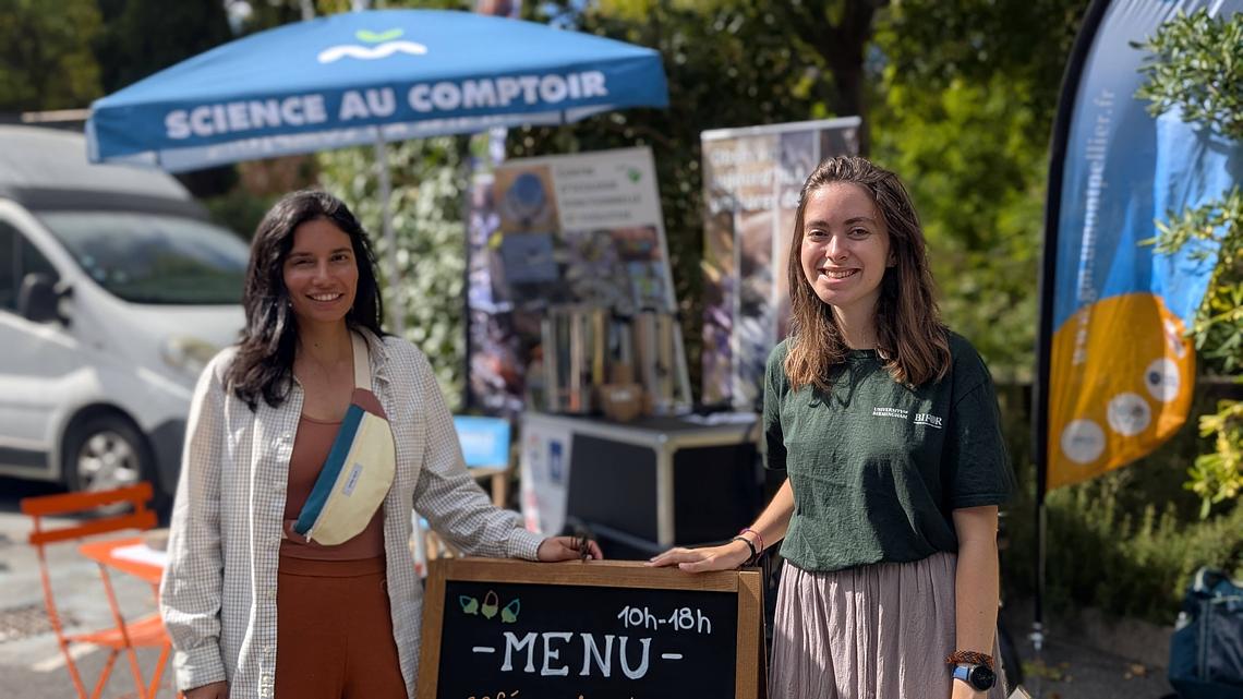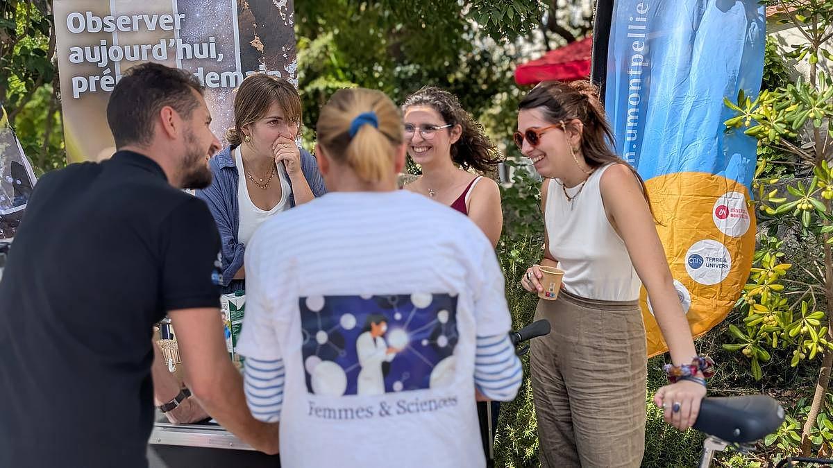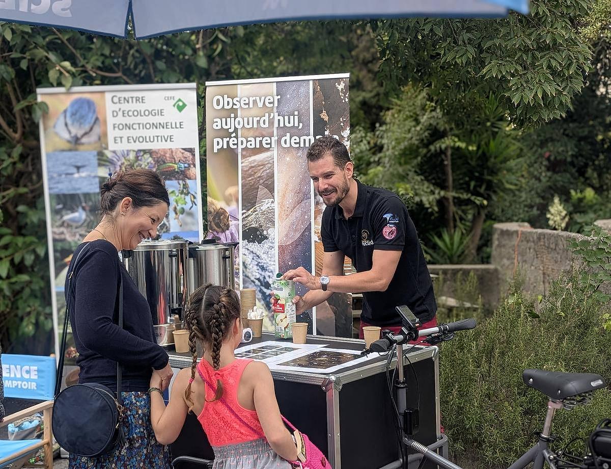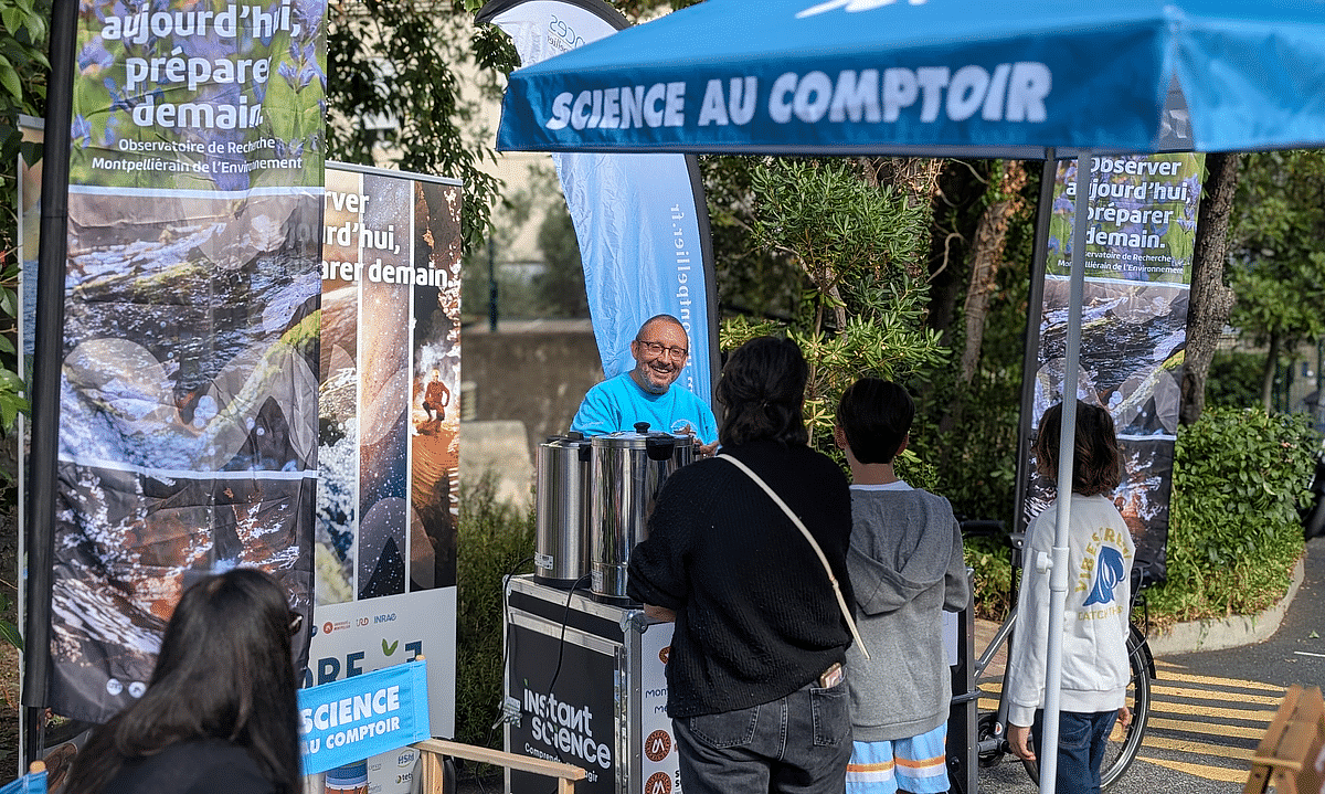 Samedi 4 octobre, à la Fête de la Science Montpellier, un bar pas comme les autres a attiré la foule du Village des Sciences. Derrière le comptoir ? Pas de baristas… mais des scientifiques ! Treize membres de l’Université de Montpellier et du CNRS issus des laboratoires Géosciences Montpellier (GM), HydroSciences Montpellier (HSM), Centre d’Écologie Fonctionnelle et Évolutive (CEFE) et Laboratoire Univers et Particules de Montpellier (LUPM), se sont relayés toute la journée pour servir cafés, jus de pommes et surtout… conversations scientifiques.