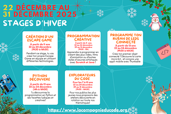 Ce stage te permettra d'utiliser la programmation python dans des contextes sympathiques et non-scolaires comme la création de jeux ou de visuels artistiques tout en vous amusant !