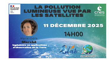 Comme l’année précédente, l’agence spatiale française (CNES) et ESERO France organisent une conférence en ligne dans le cadre du projet Climate Detectives. Cette webconférence aura lieu le jeudi 11 décembre 2025 de 14h à 15h et sera donnée par Marie-Odile Marché, ingénieure en applications d’observation de la Terre au Laboratoire d’Observation de la Terre (Lab’OT) du CNES, qui expliquera comment les satellites observent la Terre la nuit et leur utilisation pour étudier l’évolution de la pollution lumineuse.