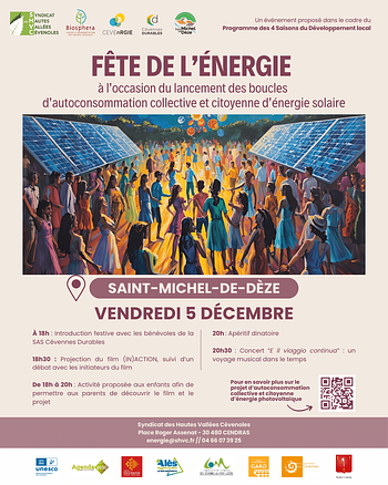 Venez inaugurer avec nous le partage de l’énergie photovoltaïque en Cévennes porté par le collectif citoyen SAS Cévennes Durables lors d’une grande soirée festive organisée avec le Syndicat des Hautes Vallées Cévenoles et la mairie de Saint-Michel-de-Dèze.